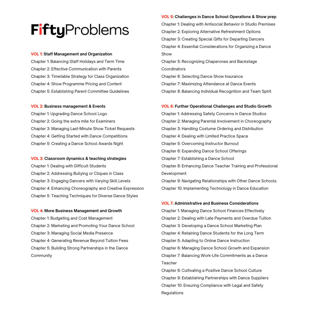 Dive deeper into the intricate world of dance education with our 7-part volume series. Each volume in '50 Problems Dance Teachers Face and What to Do About Them' hones in on a distinct facet of teaching, providing comprehensive solutions tailored to every scenario